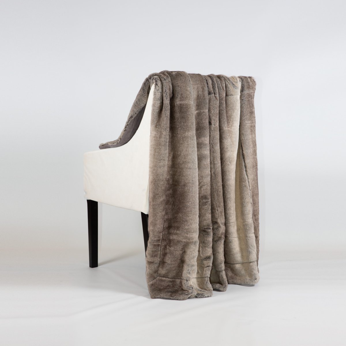 Lyxig och vacker fuskpälspläd med naturliga skiftningar i gråa toner, som ger en levande och elegant struktur på pläden.